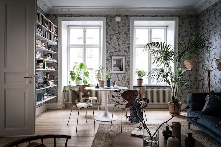 Algunas de las paredes han sido empapeladas en tonos oscuros con dibujos de flores que crean un contraste único. Me encanta esta combinación perfecta de claro-oscuros y como crean ambientes originales y muy personales.